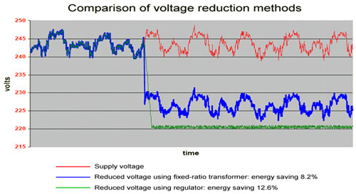 Perhaps the best approach to implementing voltage reduction is to install a voltage regulator (also known as a voltage stabiliser or optimiser). This type of equipment will ensure that the voltage on the site is maintained at the desired level, irrespective of the changes in the grid supply voltage. Voltage regulators are more complex but usually no more expensive than fixed-ratio voltage-reduction transformers, however, they have two significant